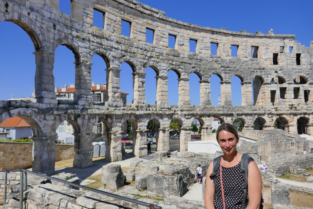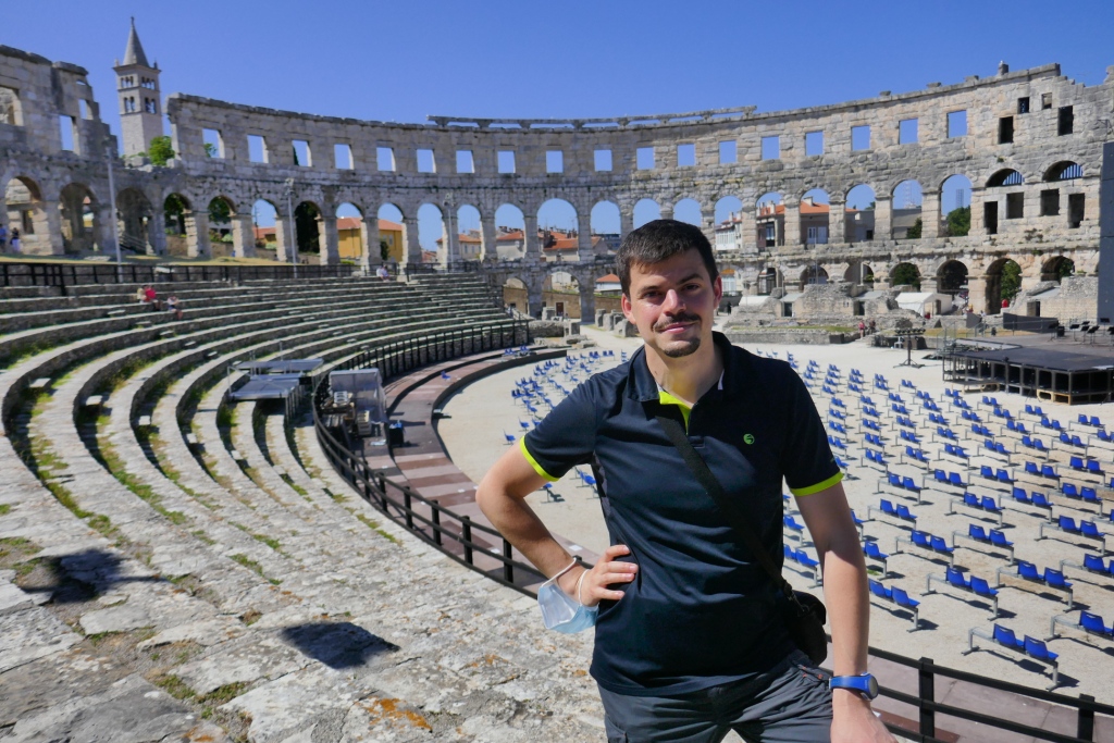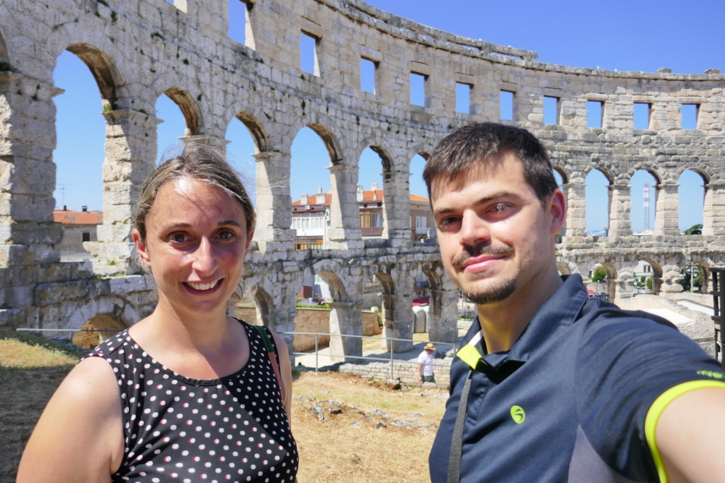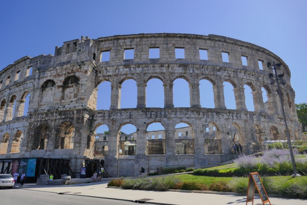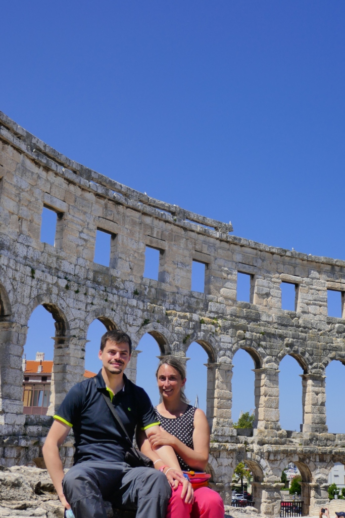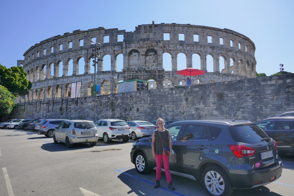 Après un premier aperçu depuis les nuages de la beauté de l’adriatique sous le soleil, nous atterrissons en début de matinée à Pula, ville situé à la pointe sud de l’Istrie. Le temps de récupérer notre voiture compacte : un SUV Suzuki SX4 aussi confortable qu’imposant nous rejoignons le centre de Pula marqué par la présence de nombreux vestiges romains, à commencer par le plus remarquable d’entre eux : son arène.
